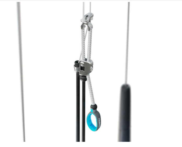 Simple and clean trim system. Compact and durable stainless steel TrimLite Cleat™. Allows precise and positive trim adjustment. Light weight design. Elasticized trim line, internalized mainline and landing lines protected with PU tubing. Minimalist system with perfect balance and trim to match the changing wind conditions.